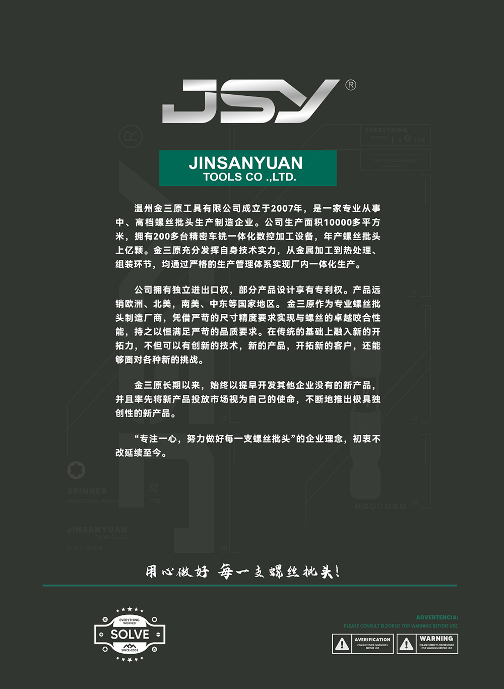 温州金三原工具有限公司,是一家集研发、生产、销售、服务于一体的高品质工业级螺丝起子头专业制造企业。公司成立于2007年,经过十多年的创新发展,积累了深厚的技术实力和行业